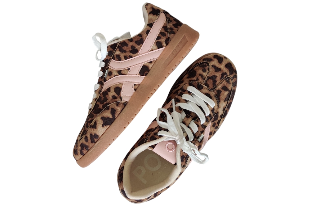 Dames sneaker van Posh. Sportieve sneaker in verschillende materialen in de kleur bruin en roze accenten. Materiaal: Stof combi. Voering: textiel . Kleur: bruin met roze. Zool: rubber. Hakhoogte: ca 3 cm.
