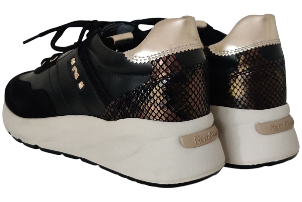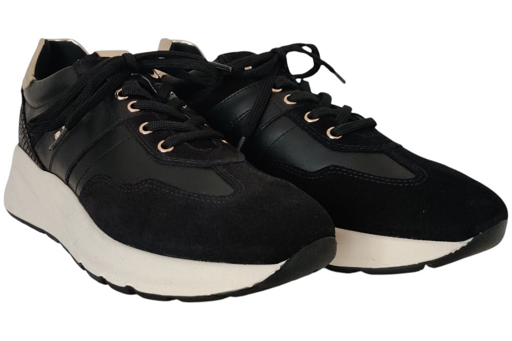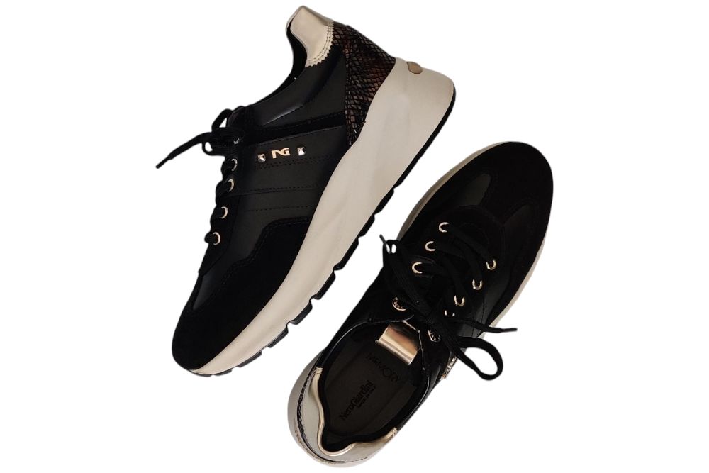 Dames sneaker van Nero Giardini. Zwart sneaker met leer en suede combi. Deze sneaker heeft een losse binnenzool. Materiaal: leer. Voering: leer. Kleur: zwart. Zool: rubber. Hakhoogte: ca 4 cm.