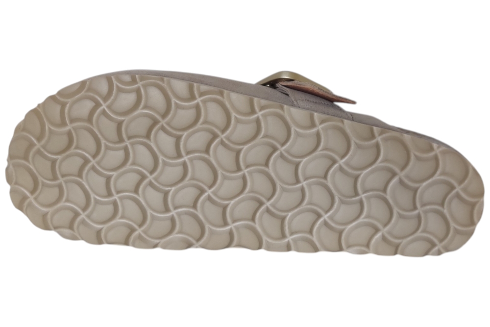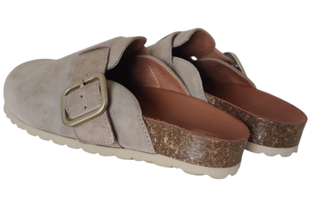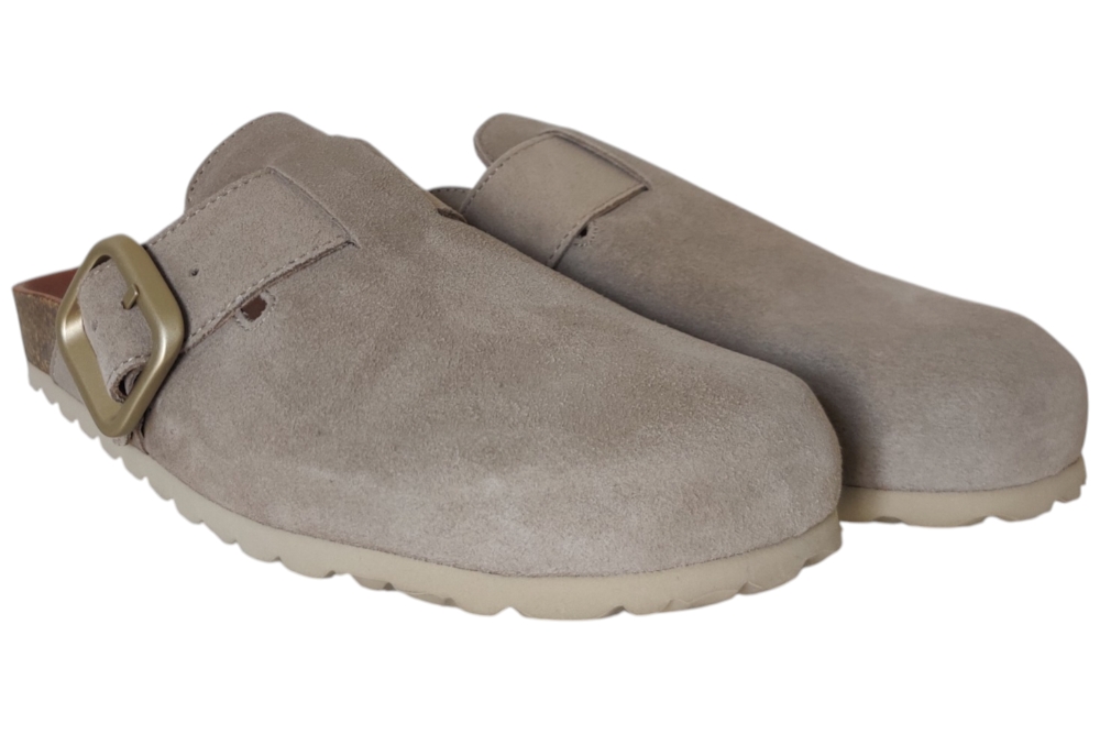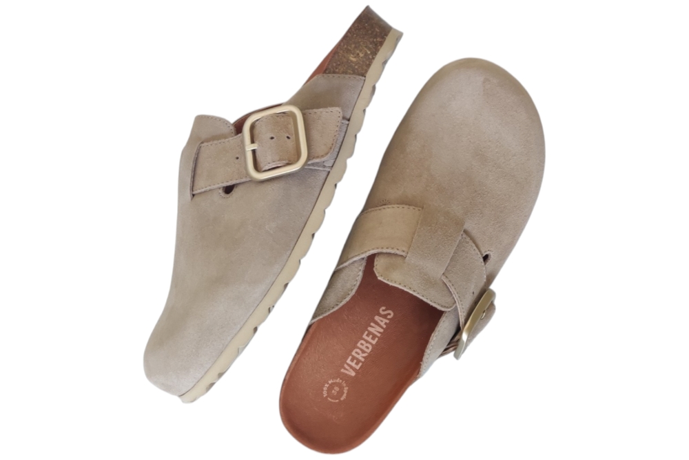 Slipper van Verbenas.Hippe slipper met band op de wreef met gesp sluiting.Kleur beige. Matriaal suede Voering leer. zool rubber ca 2 cm.