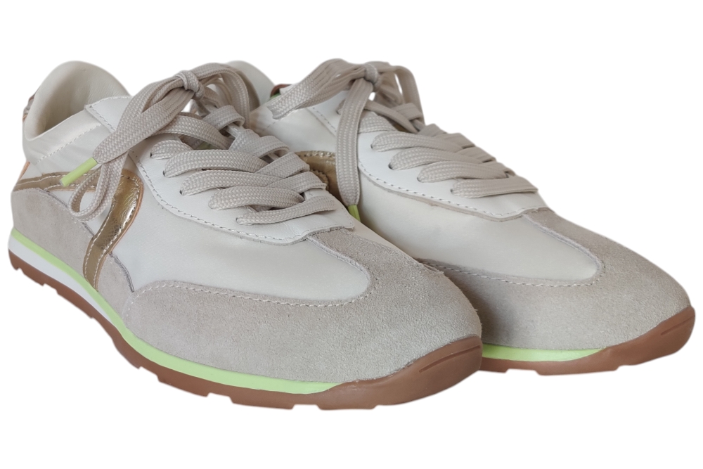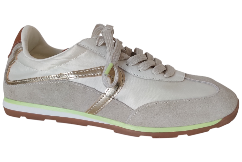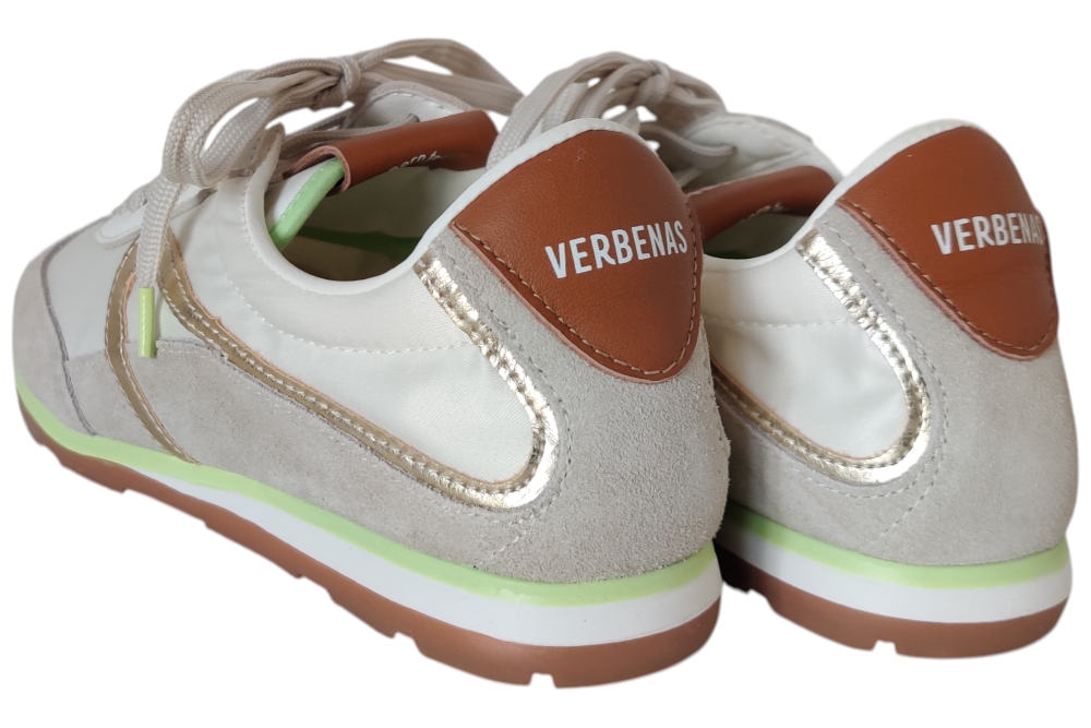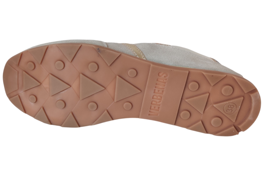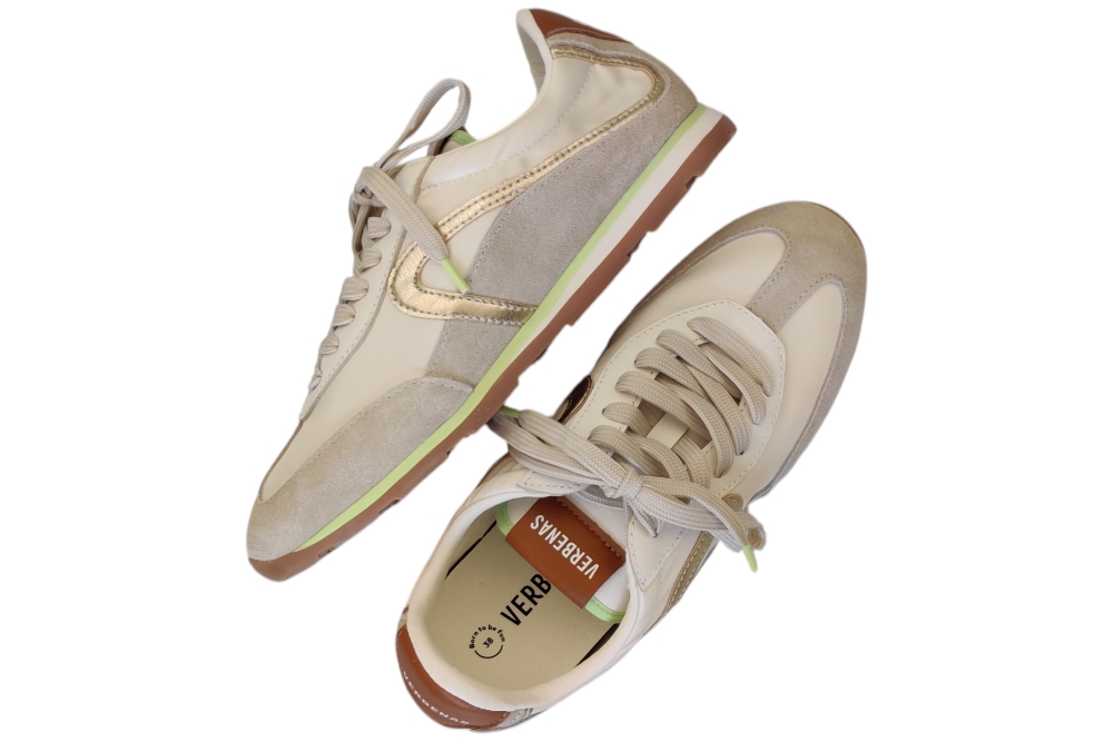 Sneaker van Verbenas. Hippe sneaker in leuke combinatie van matriale. Matriaal suede stof combi. Voering stof Kleur beige goud.Losse binnenzool. Zool rubber ca 1 cm.