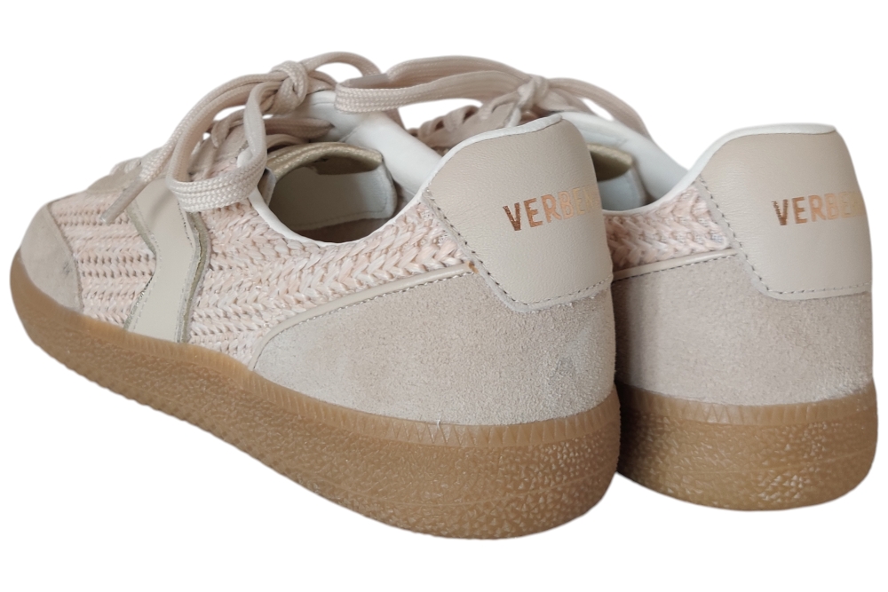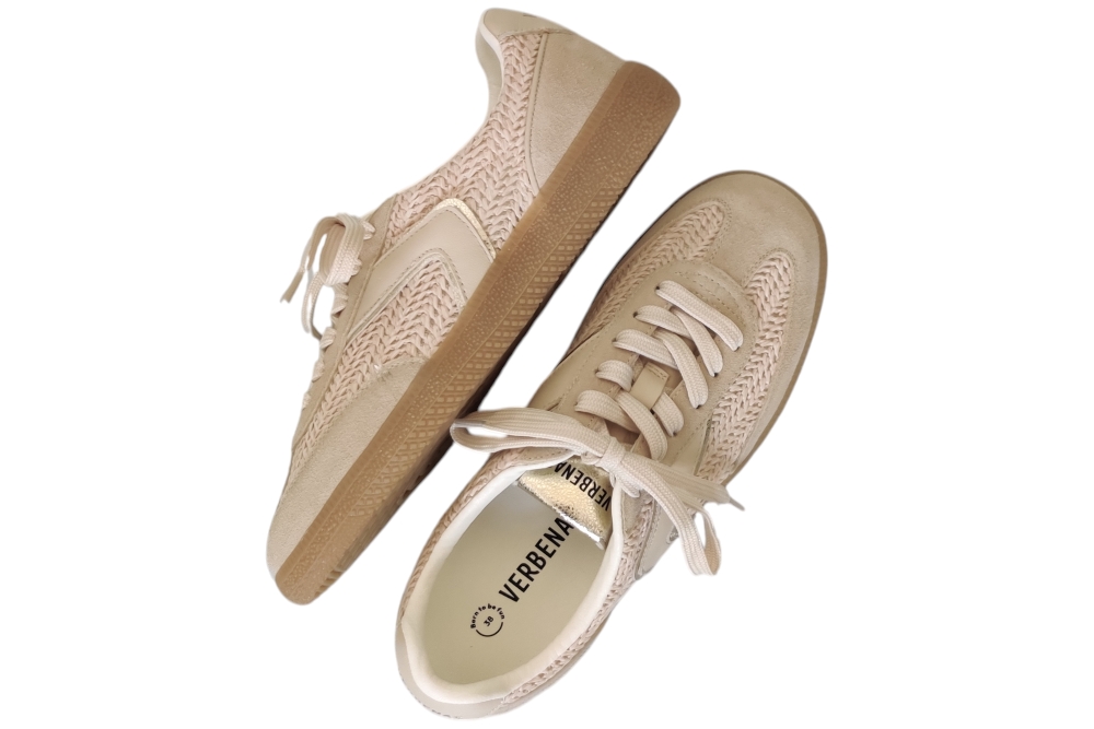 Sneaker van Verbenas. Hippe sneaker in leuke combinatie van matriale. Matriaal suede stof combi. Voering stof Kleur beige goud.Losse binnenzool. Zool rubber ca 1 cm.