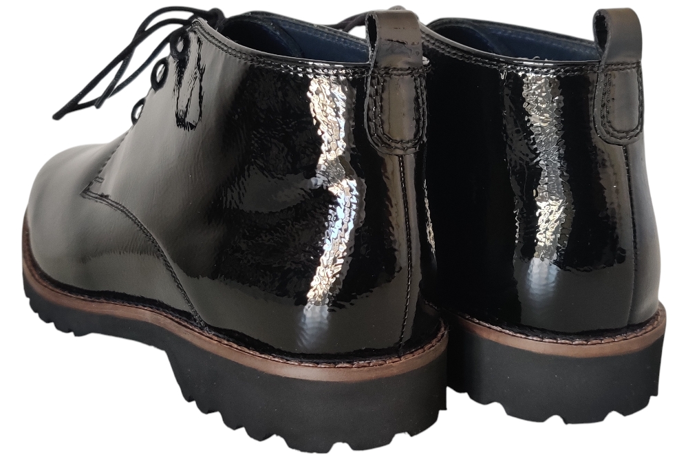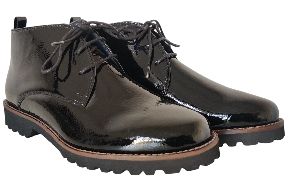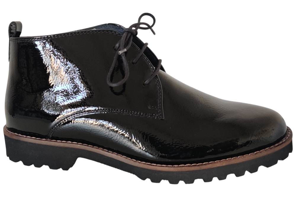 Dames veterboot van Sioux..Veterboot in het lakleer. Deze veterboot heeft een uitneembaar voetbed. Materiaal:lak. Voering: leer. Kleur: zwart. Zool: rubber. Hakhoogte: ca 2 cm.