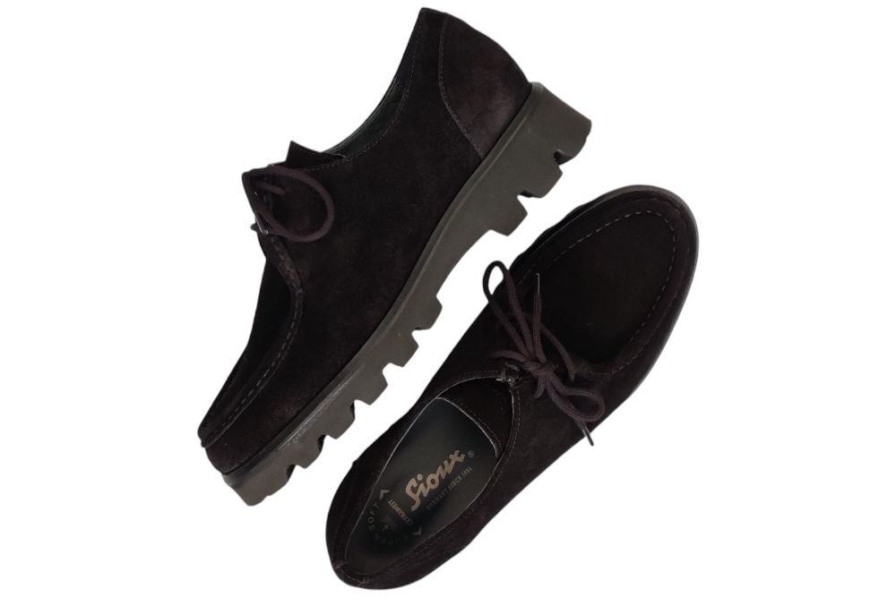 Dames veterschoen van Sioux. Materiaal: suede. Voering: leer stof.Losse binnenzool Kleur: zwart. Zool: rubber. Hakhoogte: ca 3 cm.
