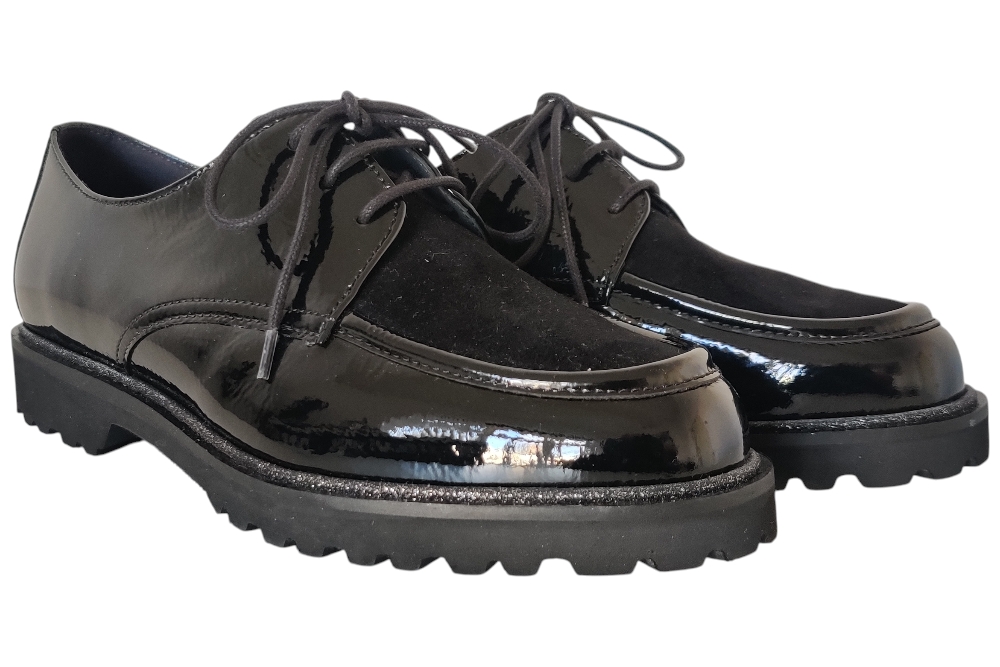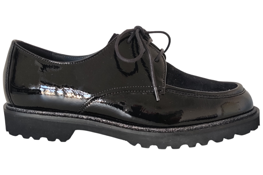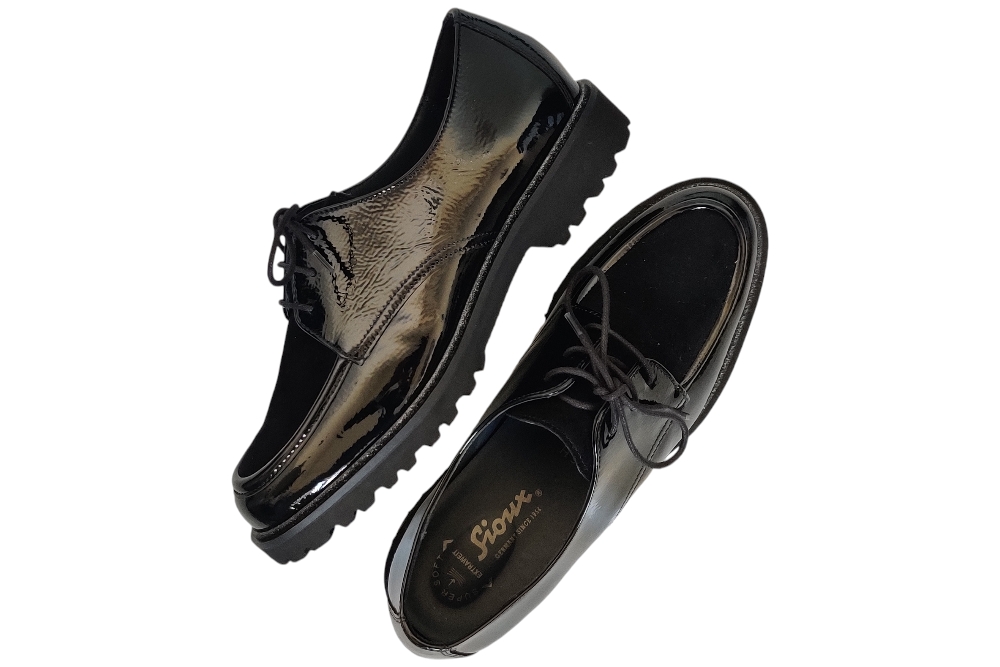 Dames veterschoen van Sioux. Mocassin achtige veterschoen .Veterschoen heeft een suede voorblad. Deze veterschoen heeft een uitneembaar voetbed. Materiaal: lak suede. Voering: leer. Kleur: zwart. Zool: rubber. Hakhoogte: ca 3 cm.