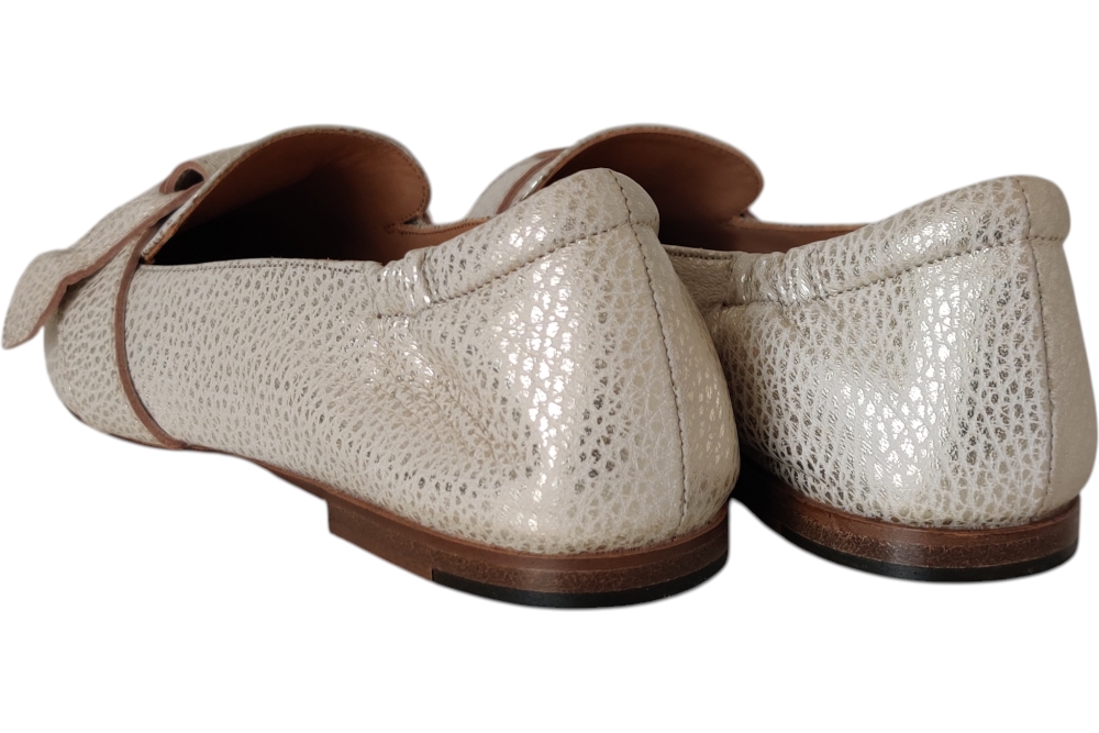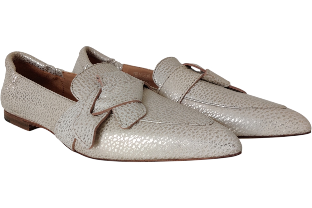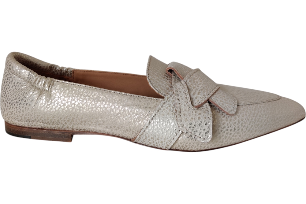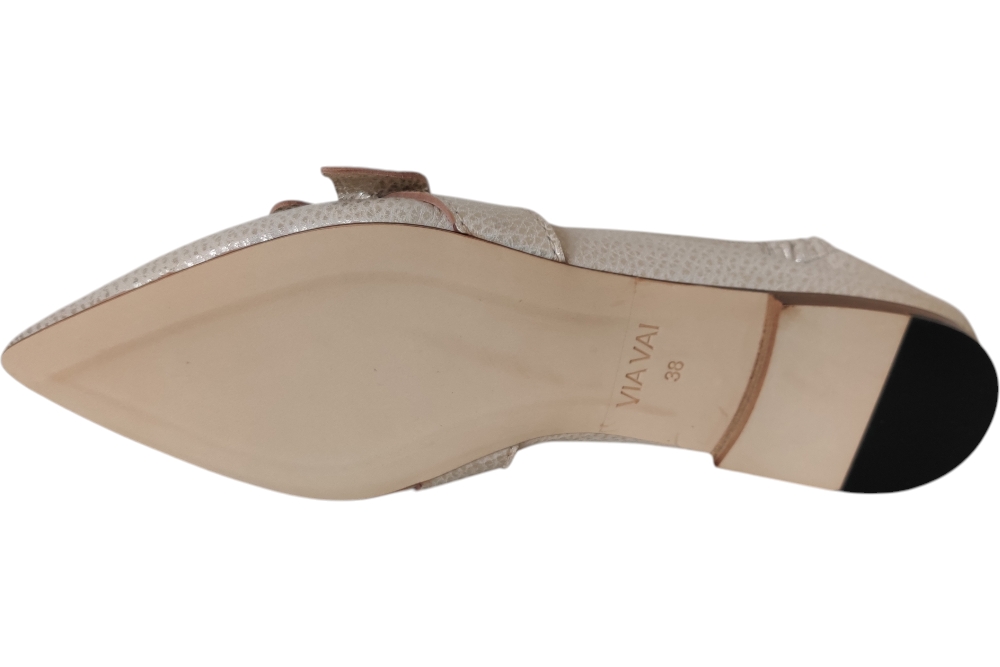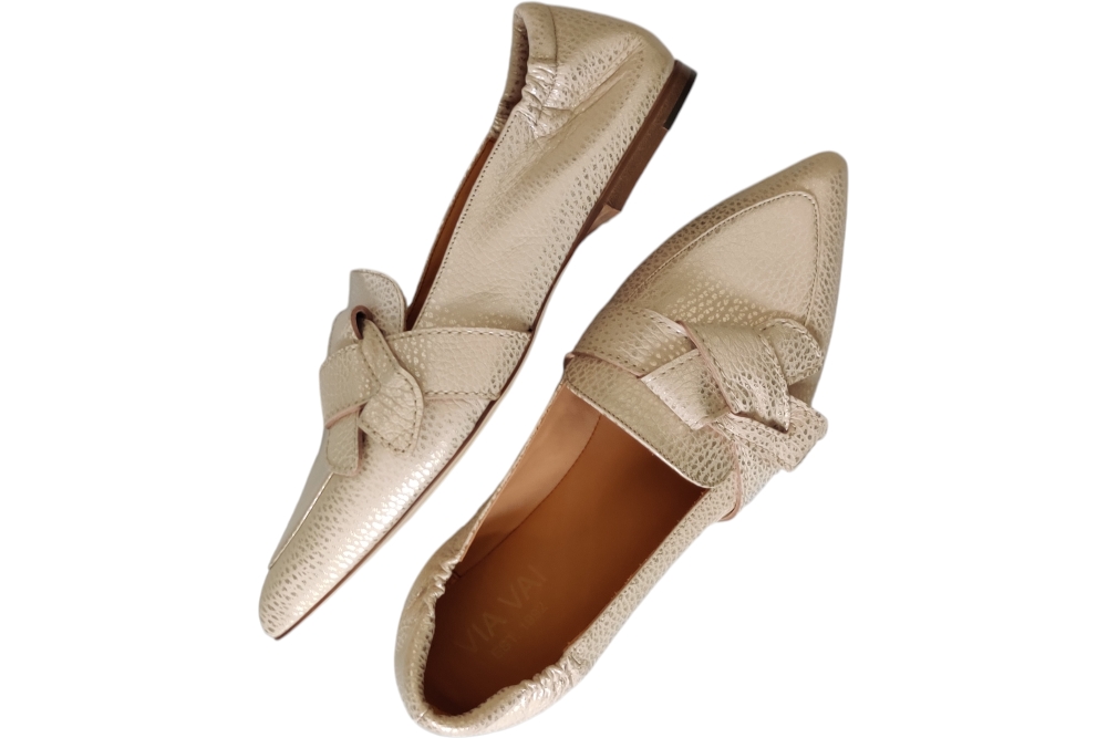 Dames instapper van Via Vai. Deze instapper heeft band op de wreef in een printleer. Materiaal: leer. Voering: leer. Kleur: goud. Zool: anti slip. Hakhoogte: ca 1 cm.