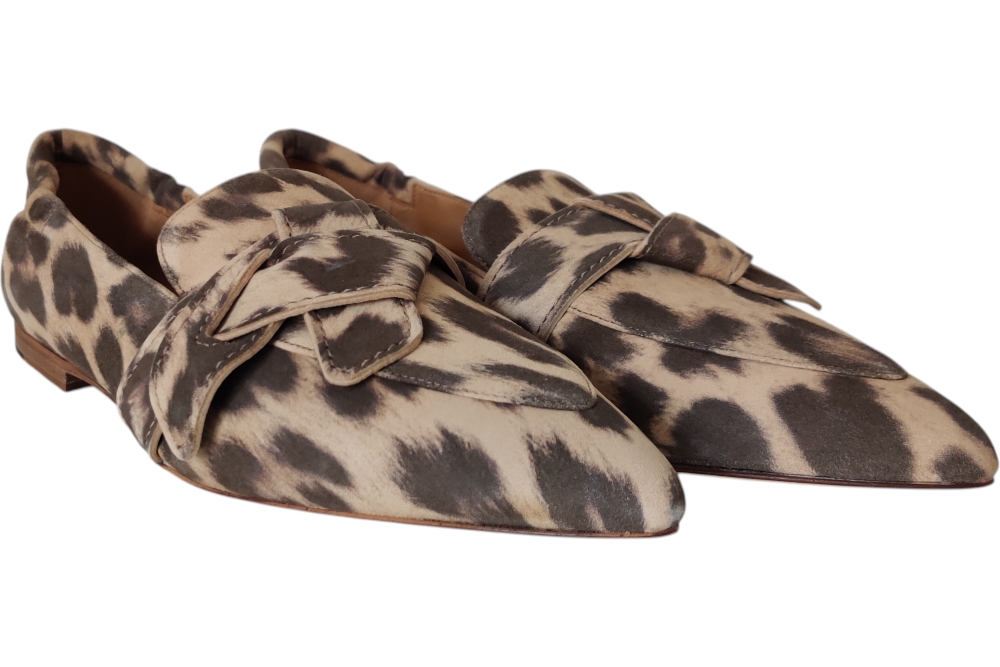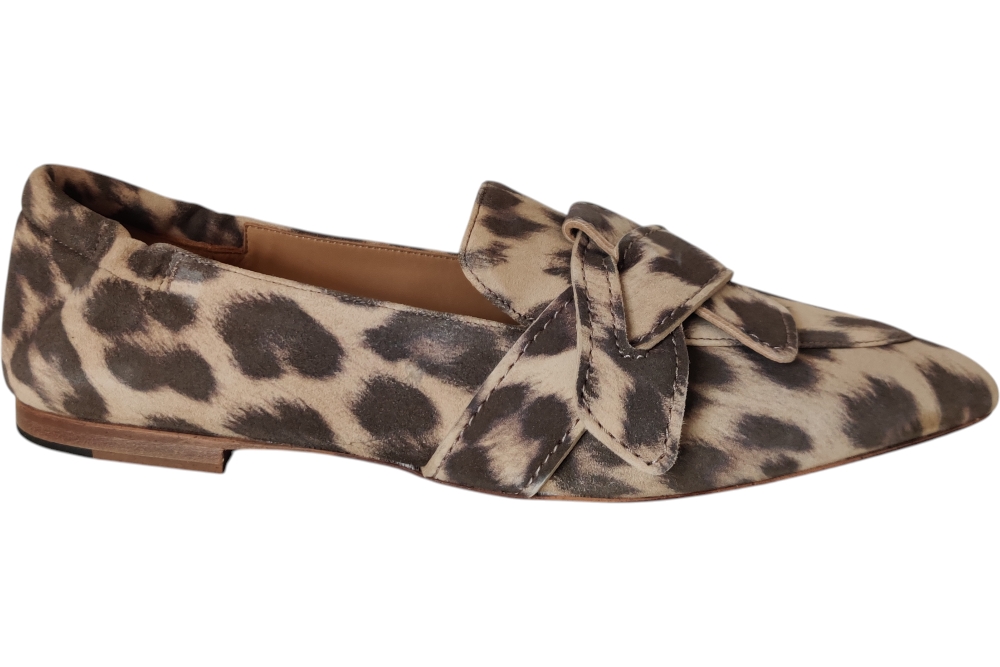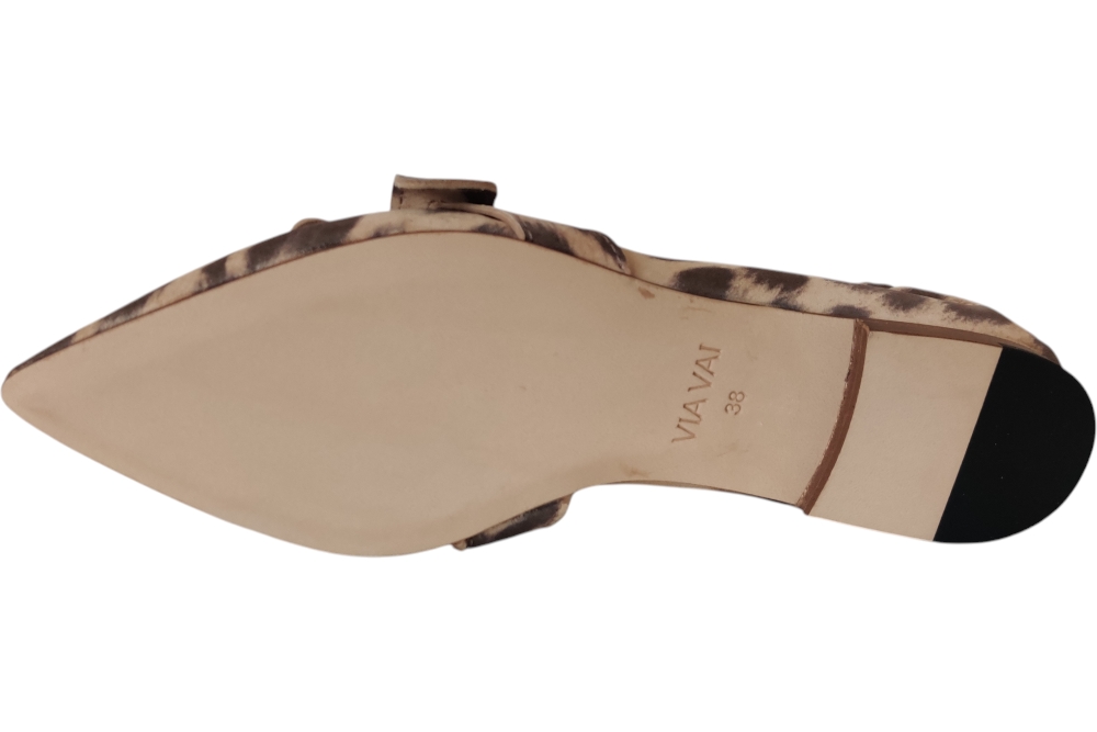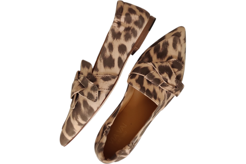 Dames instapper van Via Vai. Deze instapper heeft band op de wreef in een panterprint. Materiaal: leer. Voering: nubuck. Kleur: bruin beige. Zool: antislip. Hakhoogte: ca 1 cm.
