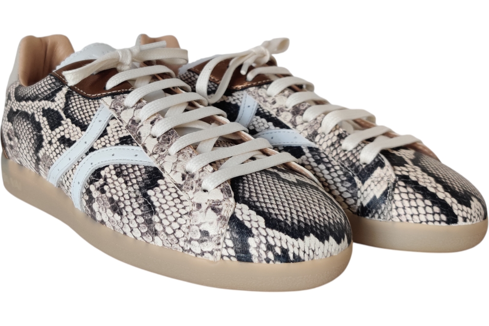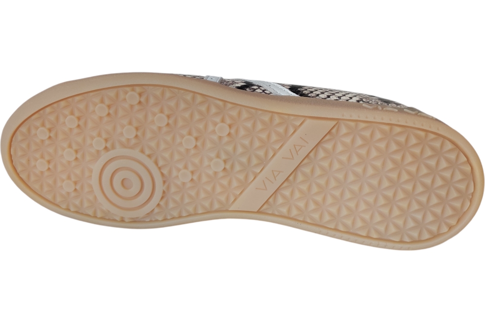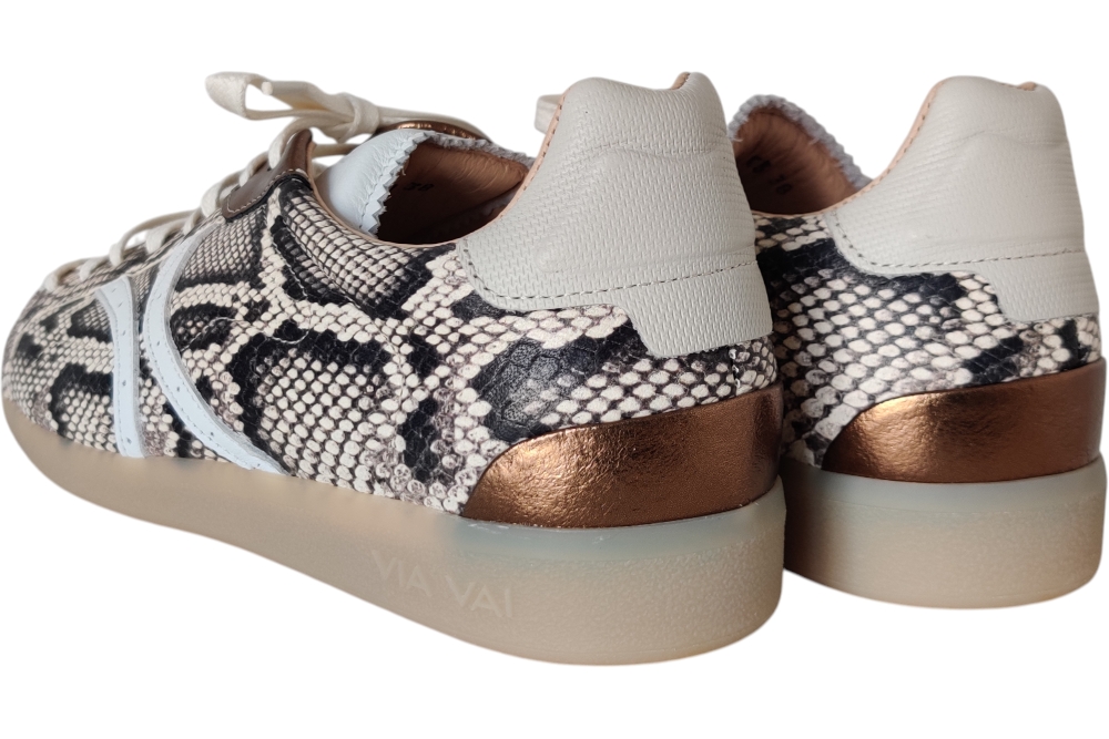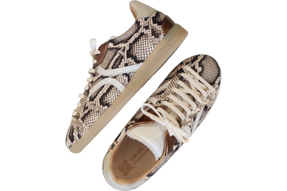 Sneaker van Via Vai. Hippe sneaker min piton print. Sneaker met uitneembaar voetbed. Matriaal leer. Voering leer stof. Kleur beige combi. Zool rubber ca 2 cm.