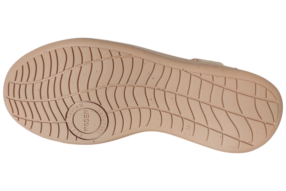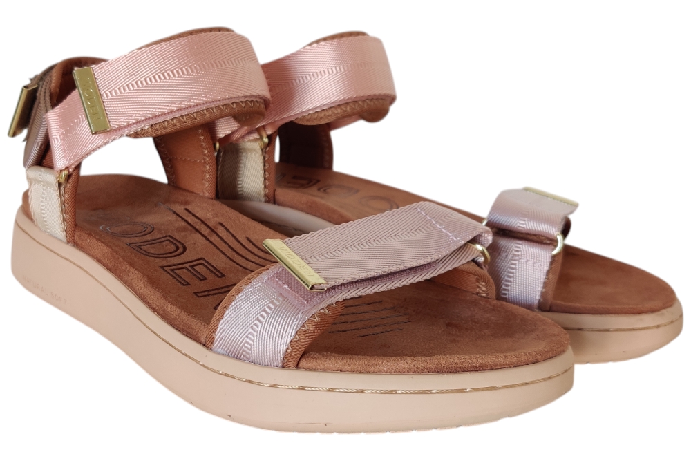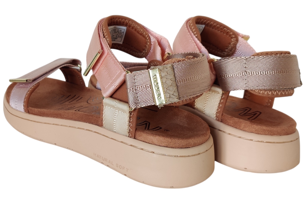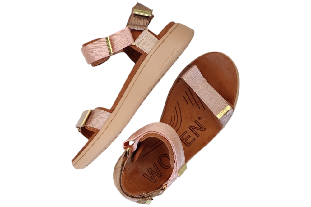 Dames sandaal van Woden. Sandaal met verstelbare wreefbanden, op een plateau zool. Materiaal: Stof. Voering: stof. Kleur: roze. Zool: rubber. Hakhoogte: ca 3 cm.